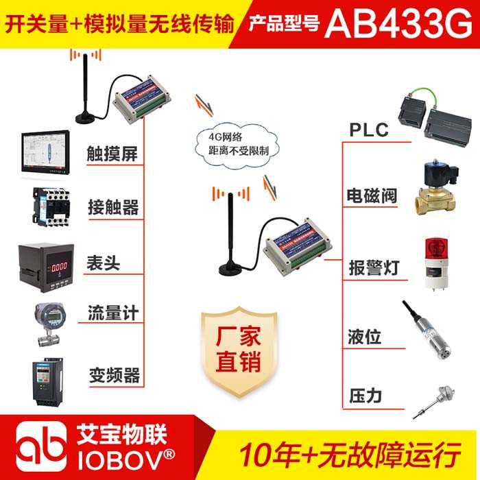 | AB433G1G:發(fā)送模塊4AI+4AO+4DI+4DO,接收模塊4AI+4AO+4DI+4DO。無線4G網(wǎng)絡。 |