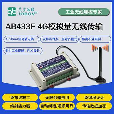 | AB433F1G:發(fā)送模塊4AI+4AO,接收模塊4AI+4AO。無線4G網(wǎng)絡(luò)。 |
