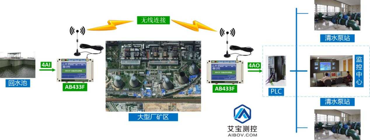 艾寶物聯(lián)的方案使用無線替代了數(shù)公里的電纜,施工簡(jiǎn)單,工作靈活可靠,不會(huì)有斷線故障,對(duì)大型廠礦的泵站和回水池控制來說是最佳方案。本方案只需要2套AB433F模擬量無線終端,即可滿足所有的需求。