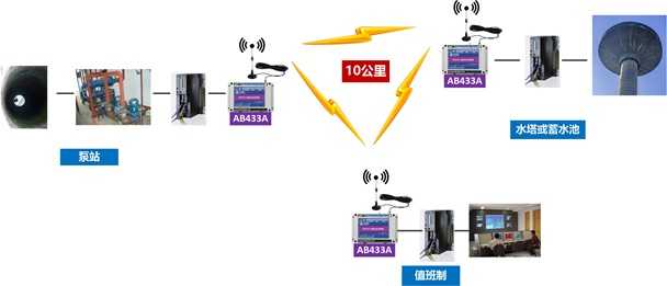 本工程采用遠距離AB433A無線RS485透傳終端進行通訊傳輸,由水源地控制箱AP1、供水水塔控制箱AP2、值班室顯示控制箱AP3組成,每個控制箱內都由用戶設備、AB433A無線RS485透傳終端、PLC三個主要部分組成。