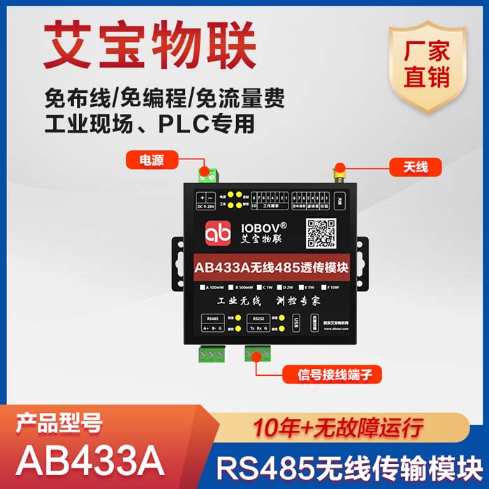 艾寶物聯(lián)IOBOV,是一家國家高新技 術(shù)企業(yè),專注于工業(yè)無線測控和數(shù)傳通信,以超遠傳輸距離、穩(wěn)定可靠的性能,賦能多樣化工業(yè)應(yīng)用場景,并在客戶中獲得了廣泛的認(rèn)可。 主要產(chǎn)品包括各種類型的無線傳輸模塊,如開關(guān)量無線傳輸模塊(AB433)、模擬量無線傳輸(AB433F),PLC無線傳輸模塊(AB433A),PLC以太網(wǎng)無線傳輸模塊(AB433L)等。
