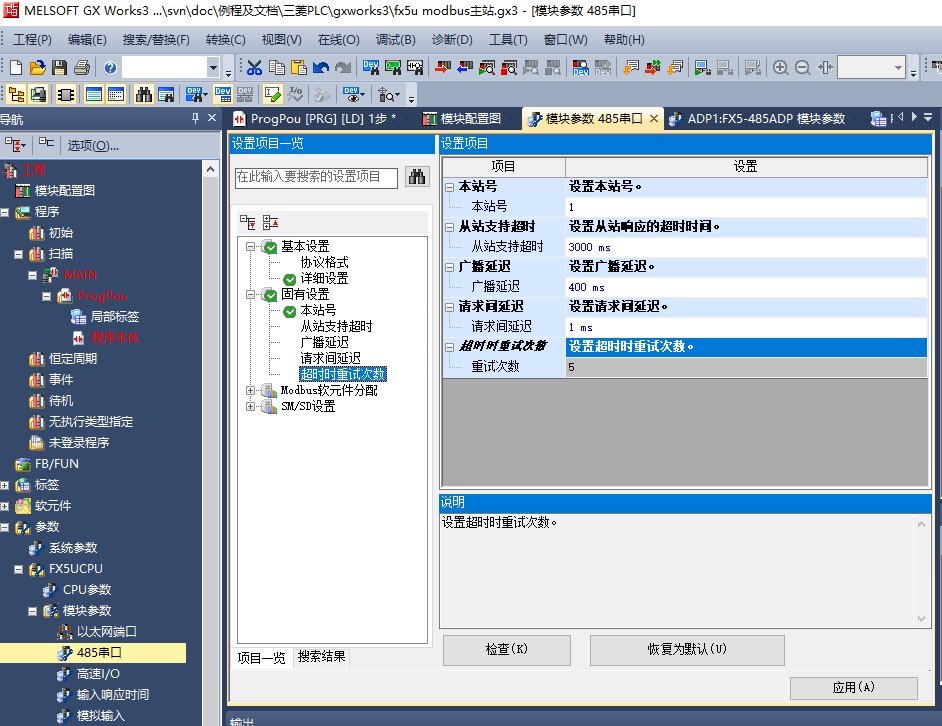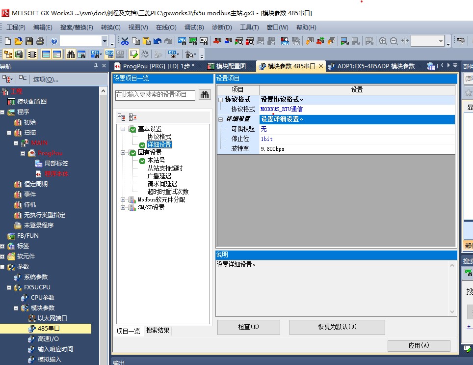 在“參數(shù)設(shè)置”中,找到“FX5U CPU”下的“模塊參數(shù)”,然后配置“485串口”。