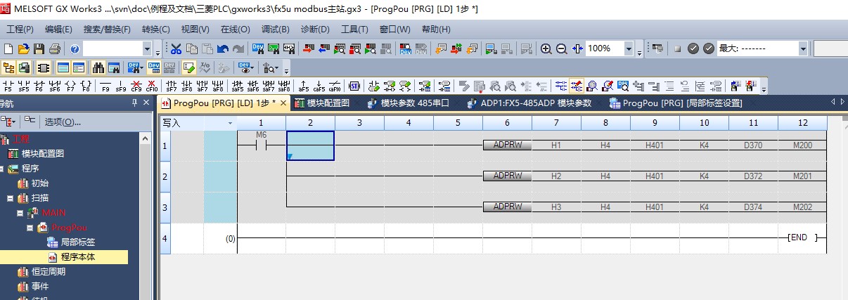 使用三菱FX5U PLC的ADPRW指令,通過Modbus協(xié)議與3臺從站設(shè)備進行通信,以讀取從設(shè)備中H401地址開始的連續(xù)4個保持寄存器的值,并將這些值存儲在PLC的D370開始的連續(xù)數(shù)據(jù)寄存器 中。