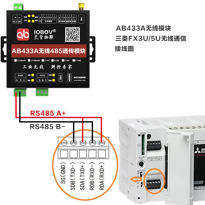 三菱FX3U/FX5U PLC的RDA與SDA端口,并聯(lián)接入AB433A的A+端口