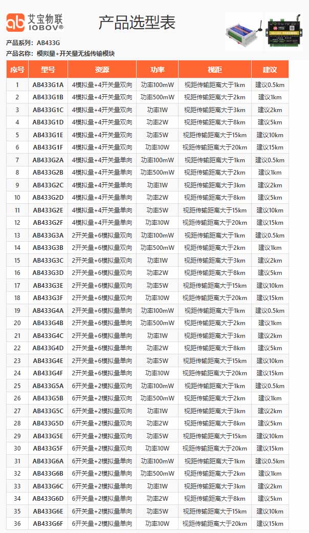 艾寶物聯(lián)IOBOV,是一家國家高新技術(shù)企業(yè),專注于工業(yè)無線測控和數(shù)傳通信,以超遠(yuǎn)傳輸距離、穩(wěn)定可靠的性能,賦能多樣化工業(yè)應(yīng)用場景,并在客戶中獲得了廣泛的認(rèn)可。 主要產(chǎn)品包括各種類型的無線傳輸模塊,如開關(guān)量無線傳輸模塊(AB433E)、模擬量無線傳輸(AB433F),PLC無線傳輸模塊(AB433A),PLC以太網(wǎng)無線傳輸模塊(AB433L)等。