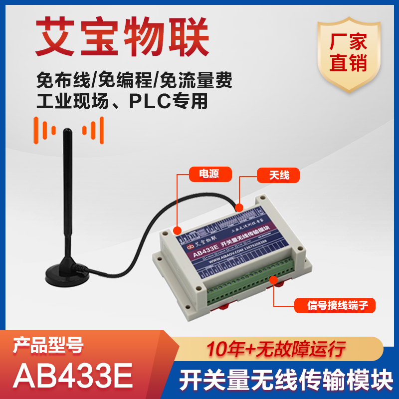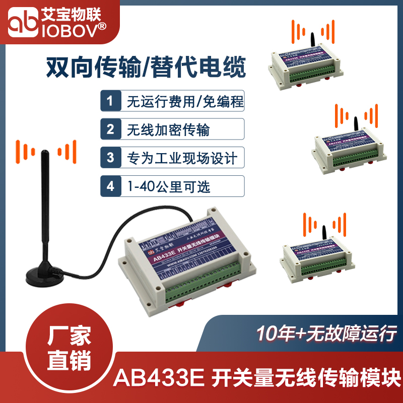 艾寶物聯(lián)AB433E無線開關(guān)量信號(hào)傳輸器,革新傳統(tǒng),輕松實(shí)現(xiàn)4-16路開關(guān)量信號(hào)的遠(yuǎn)距離無線傳輸,支持點(diǎn)對(duì)點(diǎn)、靈活點(diǎn)對(duì)多點(diǎn)模式。無需復(fù)雜編程,擺脫布線束縛,適用于各種復(fù)雜環(huán)境,特別是分散式布局與難以布線場(chǎng)景。零運(yùn)行成本,即插即用,普通電工也能快速上手調(diào)試。讓開關(guān)量控制更智能、更便捷,引領(lǐng)物聯(lián)網(wǎng)時(shí)代新潮流! 完全替代連接電纜,實(shí)現(xiàn)開關(guān)量信號(hào)轉(zhuǎn)無線 專為PLC、工業(yè)現(xiàn)場(chǎng)設(shè)計(jì)。 開關(guān)量雙向傳輸設(shè)計(jì),可采集反饋信號(hào)。 繼電器、光耦隔離設(shè)計(jì)。 免布線施工,無需流量費(fèi)用。 免編程,繞射能力強(qiáng)。 支持點(diǎn)對(duì)點(diǎn)、點(diǎn)對(duì)多模式。 10年+無線故障運(yùn)行時(shí)間實(shí)例。