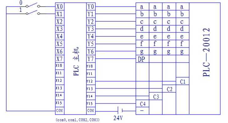 輸出地址:顯示a段——Y000 顯示公共端C1——Y0l2