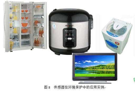 傳感器在我們的日常生活中隨處可見,如圖8所示的家用電器中都使用了傳感器:電冰箱、電飯煲中的溫度傳感器;空調(diào)中的溫度和濕度傳感器;洗衣機(jī)中的液位傳感器;煤氣灶中的煤氣泄漏傳感器;水表、電表、電視機(jī)和影碟機(jī)中的紅外遙控器;照相機(jī)中的光傳感器;汽車中燃料計(jì)和速度計(jì)等等。