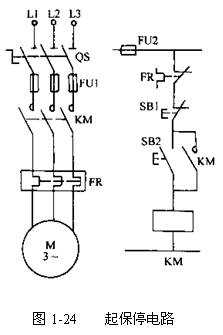 在自動控制電路中,起動按鈕SB2,停止按鈕SB1和交流接觸器KM組成了起動、保持、停止(簡稱起保停電路)典型控制電路。圖1-24是一個(gè)常用的最簡單的控制電路。