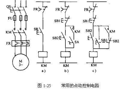 起保停電路實(shí)現(xiàn)了電動機(jī)的連續(xù)運(yùn)行控制。但有些生產(chǎn)機(jī)械要求按鈕按下時(shí),電動機(jī)運(yùn)轉(zhuǎn),松開按鈕時(shí),電動機(jī)就停止,這就是點(diǎn)動控制。如圖1-25圖a所示。圖b、c是實(shí)現(xiàn)點(diǎn)動與連續(xù)運(yùn)行的電路。