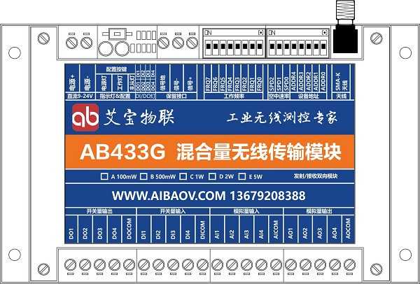 | AB433G3x:發(fā)送模塊2DI+2DO+6AI+6AO,接收模塊2DI+2DO+6AI+6AO。x代表功率代碼。 |