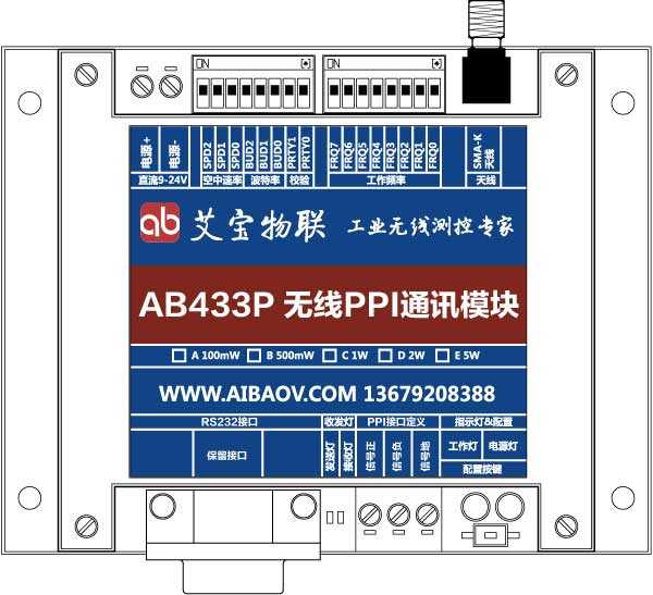 | AB433P1x:西門子PLC專用PPI無線通訊模塊,波特率最高19200bps,實現(xiàn)西門子PLC間無線通信,西門子PLC與觸摸屏間無線通信,組態(tài)軟件與PLC間無線通信。x代表功率代碼。 |