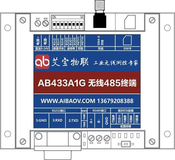 | AB433A1G表示:無線模塊具有RS232和RS485接口,自動(dòng)二選一,同一時(shí)刻只能一個(gè)接口工作;無線4G網(wǎng)絡(luò)。 |
