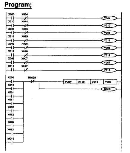 要注意的是只用到一個PLSY指令,這是因為它的輸出如所要求的那樣,直接與四個電機中的每個相連(一個電機對應于一個窗戶)。檢測窗戶位置為全開或全關(guān),如果其中一個條件存在,與它對應的控制電機就關(guān)斷。