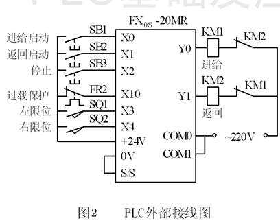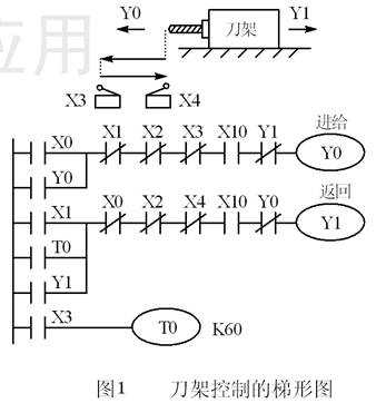在電動機(jī)正反轉(zhuǎn)控制梯形圖的基礎(chǔ)上,設(shè)計(jì)出滿足要求的PLC外部接線圖和梯形圖(見圖2和圖1)。為使刀架的進(jìn)給運(yùn)動自動停止,將左限位開關(guān)X3的常閉觸點(diǎn)與控制進(jìn)給的Y0的線圈串聯(lián)。為了在左限位開關(guān)X3處進(jìn)行無進(jìn)給切削,用X3的常開觸點(diǎn)來控制定時器T0的線圈,T0的定時時間到時,其常開觸點(diǎn)閉合,給控制Y1的起保停電路提供起動信號,使Y1的線圈通電,刀架自動返回。刀架離開X3所在位置后,X3的常開觸點(diǎn)斷開,T0被復(fù)位。刀架回到X4所在位置時,X4的常閉觸點(diǎn)斷開,使Y1的線圈斷電,刀架停在起始位置。
