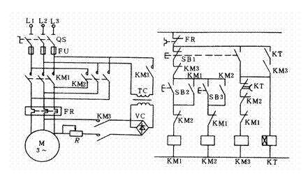 為電動機(jī)按時間原則控制可逆運(yùn)行的能耗制動控制線路。在其正常的正向運(yùn)轉(zhuǎn)過程中,需要停止時,可按下停止按