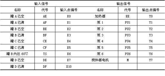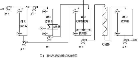 圖1中表示該項目工藝要求。圖中罐A、罐B的容量相等且為罐C、罐D容量的一半。要求將溶液A和溶液B分別由泵1和泵2加到罐A和罐B中,罐B滿后將溶液B加熱到60℃,然后用泵3和泵4把罐A和罐B中的溶液全部加入到罐C中以1比1的比例混合,罐C裝滿后要繼續(xù)攪拌60秒進行充分的化學反應,然后由泵5把罐C中的成品全部經由過濾器送到成品罐D中,罐D裝滿后開啟泵6把整罐成品全部抽走。接著開始新一周期的循環(huán)。注意,當罐空時,傳感器應處于斷開狀態(tài)。