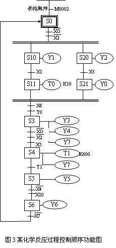 根據工藝要求設計出順序控制功能圖如圖3所示。圖中各步用狀態(tài)繼電器S表示,這里S作普通輔助繼電器使用,在進入步進程序之后,開始分別進入A、B兩罐的A液、B液注入程序。由于B罐要進行加熱,因此,比A罐要多一步。為了同時開始將A、B兩液體注入反應罐C前,關掉A罐注入泵1,人為增加一個時間定時步,已完成對S10步的復位。