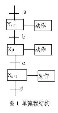 在圖1中,當(dāng)n-1為活動(dòng)步時(shí),轉(zhuǎn)換條件b成立,則轉(zhuǎn)換實(shí)現(xiàn),n步變?yōu)榛顒?dòng)步,同時(shí)n-1步關(guān)斷。由此可見(jiàn),第n步成為活動(dòng)步的條件是:Xn-1=1,b=1;第n步關(guān)斷的條件只有一個(gè)Xn+1=1。用邏輯表達(dá)式表示功能流程圖的第n步開通和關(guān)斷條件為: