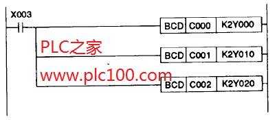 每個(gè)BCD碼數(shù)字要求4個(gè)輸出,因此要求使用Y**0到Y**7。本例子中,C000, 001和002分別使用Y00000-7 ,010-017, 020-027(注:每個(gè)計(jì)數(shù)器有2個(gè)數(shù)字)。K2Y *’中表示的Y**可以當(dāng)作是輸出區(qū)的首地址。