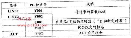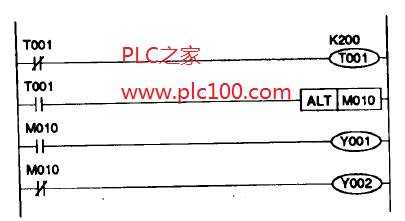 這是一個(gè)很快的響應(yīng)。定時(shí)器的復(fù)位/置位會(huì)在程序的大約一次掃描(最多兩次掃描)內(nèi)發(fā)生。在如此短的時(shí)間內(nèi),定時(shí)器的連續(xù)置位和復(fù)位使定時(shí)器觸點(diǎn)動(dòng)作如同受脈沖激勵(lì)。使用定時(shí)器T001的常開觸點(diǎn)驅(qū)動(dòng)ALT指令說(shuō)明了這一點(diǎn)。每過(guò)20秒,Y001和Y002的輸出狀態(tài)互換。