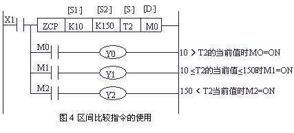 ZCP指令的功能是將一個(gè)源操作數(shù)[S·]的數(shù)值與另兩個(gè)源操作數(shù)[S1·]和[S2·]的數(shù)據(jù)進(jìn)行比較,結(jié)果送到目標(biāo)操作元件[D·]中,源數(shù)據(jù)[S1·]不能大于[S2·]。在圖4中,當(dāng)X1為ON時(shí),執(zhí)行ZCP指令,將T2的當(dāng)前值與10和150比較,比較結(jié)果送到M0~M2中,若10>T2的當(dāng)前值時(shí),M0為ON,若10≤T2的當(dāng)前值≤150時(shí),M1為ON,若150<T2的當(dāng)前值時(shí),M2為ON。當(dāng)X1為OFF時(shí),ZCP指令不執(zhí)行,M0~M2的狀態(tài)保持不變。
