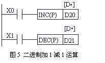 如圖5所示,當(dāng)X0每次由OFF變?yōu)?span >ON時(shí),D20中的數(shù)自動(dòng)增加1,當(dāng)X1每次由OFF變?yōu)?span >ON時(shí),D21中的數(shù)自動(dòng)減1。