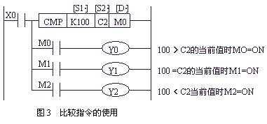 若100<C2的當(dāng)前值時(shí),M2為ON。當(dāng)X0為OFF時(shí),不進(jìn)行比較,M0~M2的狀態(tài)保持不變。