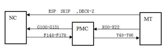 4)NC→PLC地址表。該表為NC側(cè)向PMC側(cè)傳送信號(hào)的接口地址表。由8位27字節(jié)地址構(gòu)成(即:P14~8F156,F160~F163,F171~P178)。信號(hào)地址用FOOO.O表示。這些信號(hào)也已由CNC廠家定義,用戶不能增刪和改變。