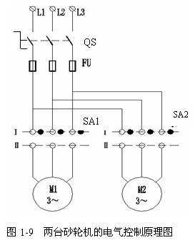 砂輪機(jī)通常用于修磨刀具。高速旋轉(zhuǎn)的砂輪裝在電動(dòng)機(jī)的軸上,與電動(dòng)機(jī)轉(zhuǎn)子同速旋轉(zhuǎn)。雖然它也只要電機(jī)單向旋轉(zhuǎn),但由于工作時(shí)粉塵太多,不宜采用開(kāi)啟式負(fù)荷開(kāi)關(guān),而封閉式負(fù)荷開(kāi)關(guān)又不適宜頻繁操作,所以砂輪機(jī)一般采用萬(wàn)能轉(zhuǎn)換開(kāi)關(guān)控制。圖1-9時(shí)兩臺(tái)砂輪機(jī)的電路圖。