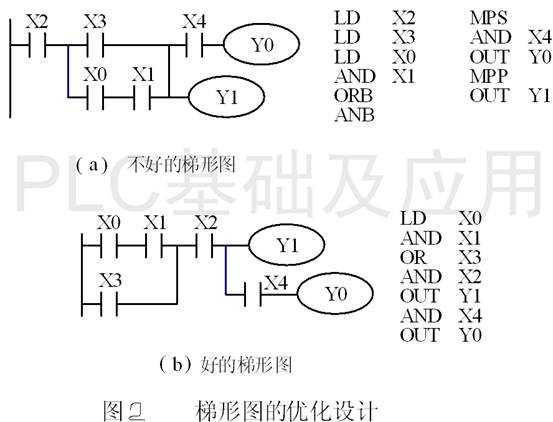 在設(shè)計(jì)并聯(lián)電路時(shí),應(yīng)將單個(gè)觸點(diǎn)的支路放在下面;設(shè)計(jì)串聯(lián)電路時(shí),應(yīng)將單個(gè)觸點(diǎn)放在右邊,否則將多使用一條指令(見圖2)。