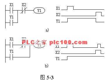 圖5-3a為停止優(yōu)先程序,即當(dāng)X1和X2同時接通,則Y1斷開。圖5-3b為起動優(yōu)先程序,即當(dāng)X1和X2同時接通,則Y1接通。起保停程序也可以用置位(SET)和復(fù)位(RST)指令來實(shí)現(xiàn)。在實(shí)際應(yīng)用中,起動信號和停止信號可能由多個觸點(diǎn)組成的串、并聯(lián)電路提供。
