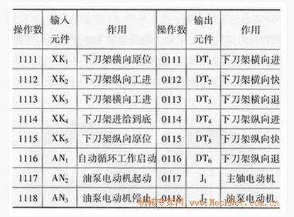 (1)編制開(kāi)關(guān)表即將機(jī)床的各輸入輸出元件分配到PLC輸入輸出點(diǎn)上,即分配地址。以C7532車床的部分開(kāi)關(guān)表為例,見(jiàn)附表。