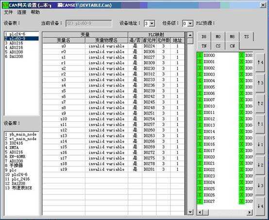 4.2整個(gè)CAN總線(xiàn)網(wǎng)絡(luò)互聯(lián)也全由CANSET軟件來(lái)實(shí)現(xiàn),它是圖形化界面的軟件,設(shè)置起來(lái)十分簡(jiǎn)便,并且在PLC的梯形圖中除了地址和主從站外無(wú)需再對(duì)其他相關(guān)內(nèi)容進(jìn)行設(shè)置,在一定程度上簡(jiǎn)化了程序設(shè)計(jì)的工作量。下圖是在CANSET下設(shè)置的本系統(tǒng)CAN網(wǎng)絡(luò)配置: