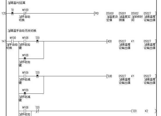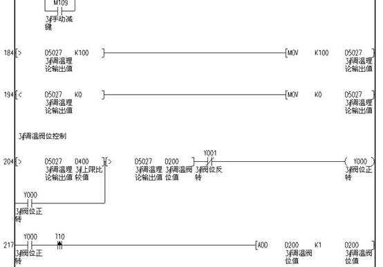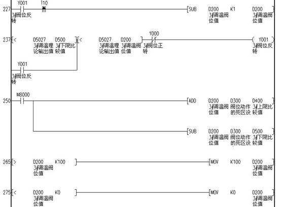 4.4系統(tǒng)工作流程:下層網(wǎng)絡(luò)的AD1216、AD1208設(shè)備把采集上來(lái)的溫度和壓力信號(hào)轉(zhuǎn)化為數(shù)據(jù)信號(hào)上傳到Easy-M2416R-1;通過(guò)PID運(yùn)算,控制各個(gè)執(zhí)行器的正反轉(zhuǎn)和DA的輸入值,從而控制窯爐的各段溫度和壓力;另外在邏輯控制上完成各個(gè)風(fēng)機(jī)和電磁閥的控制。下面是其中一路執(zhí)行器正反轉(zhuǎn)控制的梯形圖程序: