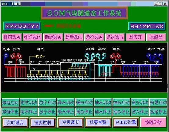 此窯是一條80m長(zhǎng)的燃?xì)馑淼栏G,共有溫度檢測(cè)點(diǎn)20個(gè)(K分度12個(gè),S分度8個(gè)),其中10個(gè)溫度點(diǎn)受控,壓力檢測(cè)點(diǎn)2個(gè),10個(gè)燃?xì)鈭?zhí)行器,10只燒嘴火焰檢測(cè),風(fēng)機(jī)有:排煙風(fēng)機(jī)2臺(tái)(一用一備)、助燃風(fēng)機(jī)2臺(tái)(一用一備)、急冷風(fēng)機(jī)2臺(tái)(一用一備)、緩冷風(fēng)機(jī)2臺(tái)(一用一備)、抽熱風(fēng)機(jī)2臺(tái)(一用一備)、窯頭窯尾氣幕風(fēng)機(jī)各1臺(tái)。10點(diǎn)溫度控制是通過(guò)控制執(zhí)行器閥位大小,改變?nèi)剂献⑷攵嗌?,從而使溫度穩(wěn)定。2點(diǎn)壓力控制通過(guò)調(diào)節(jié)排煙風(fēng)機(jī)和急冷風(fēng)機(jī)轉(zhuǎn)速來(lái)控制,即通過(guò)調(diào)節(jié)排煙和急冷變頻器頻率來(lái)控制壓力。此外還有風(fēng)機(jī)連鎖,燒嘴熄火報(bào)警及各類(lèi)故障報(bào)警。