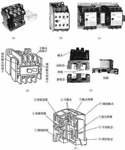 (d)交流接觸器的外形結(jié)構(gòu)說明 (e)(f)接觸器內(nèi)部結(jié)構(gòu)