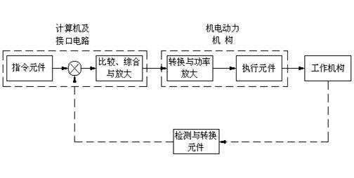 機(jī)電控制系統(tǒng)的工作原理是:有指令元件發(fā)出指令,通過比較、綜合與放大元件將此信號與輸出反饋信號比較,再將差值進(jìn)行處理和放大、控制及轉(zhuǎn)換,將此處理后的信號加到功率放大元件并施加到執(zhí)行元件的輸入信號,使得執(zhí)行元件按指令的要求運(yùn)動;而執(zhí)行元件往往和機(jī)電裝備的工作機(jī)構(gòu)相連接,從而使機(jī)電裝備的被控量(如位移、速度、力、轉(zhuǎn)矩等)符合所要求的規(guī)律。