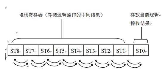 在基本指令和功能指令執(zhí)行中,用一個堆棧寄存器暫存邏輯操作的中間結(jié)果,堆棧寄存器有9位(如圖1所示),按先進后出、后進先出的原理工作。當前操作結(jié)果壓入時,堆棧各原狀態(tài)全部左移一位;相反地取出操作結(jié)果時堆棧全部右移一位,最后壓入的信號首先恢復讀出。