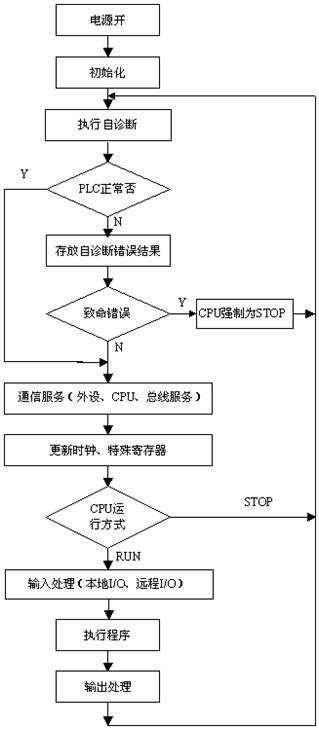 為了滿足工業(yè)邏輯控制的要求,同時結合計算機控制的特點,PLC的工作方式采用不斷循環(huán)的順序掃描工作方式。每一次掃描所用的時間稱為掃描周期或工作周期。CPU從第一條指令執(zhí)行開始,按順序逐條地執(zhí)行用戶程序直到用戶程序結束,然后返回第一條指令開始新的一輪掃描。PLC就是這樣周而復始地重復上述循環(huán)掃描的。PLC工作的全過程可用圖1所示的運行框圖來表示。整個過程可分為以下幾個部分: