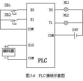 按照圖5-6,完成PLC控制系統(tǒng)的硬件連接。圖中由于脈沖信號發(fā)生器的信號與按鈕輸入信號不同,因此,不能共用一個COM端。