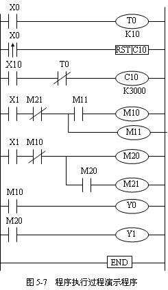 按照圖5-7提供的梯形圖,利用計算機(jī)或手持編程器寫入PLC。