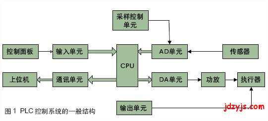 PLC控制系統(tǒng)主要由輸入部分、CPU、采樣部分、輸出控制和通訊部分組成,如圖1所示。輸入部分包括控制面板和輸入模板;采樣部分包括采樣控制模板、AD轉(zhuǎn)換模板和傳感器;CPU作為系統(tǒng)的核心,完成接收數(shù)據(jù),處理數(shù)據(jù),輸出控制信號;輸出部分有的系統(tǒng)用到DA模板,將輸出信號轉(zhuǎn)換為模擬量信號,經(jīng)過功放驅(qū)動執(zhí)行器;大多數(shù)系統(tǒng)直接將輸出信號給輸出模板,由輸出模板驅(qū)動執(zhí)行器工作;通訊部分由通訊模板和上位機(jī)組成。
