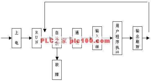 當(dāng) PLC投入運行后,其工作過程一般分為三個階段,即輸入采樣、用戶程序執(zhí)行和輸出刷新三個階段。完成上述三個階段稱作一個掃描周期。在整個運行期間,PLC的CPU以一定的掃描速度重復(fù)執(zhí)行上述三個階段。