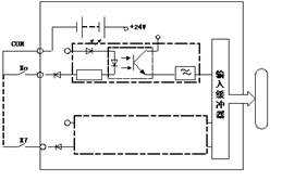 接到PLC輸入接口的輸入器件是:各種開(kāi)關(guān)、按鈕、傳感器等。各種PLC的輸入電路大都相同,PLC輸入電路中有光耦合器隔離,并設(shè)有RC濾波器,用以消除輸入觸點(diǎn)的抖動(dòng)和外部噪聲干擾。PLC輸入電路通常有三種類(lèi)型:直流(12∽24)V輸入、交流(100∽120)V輸入與交流(200∽240)V輸入和交直流(12∽24)V輸入