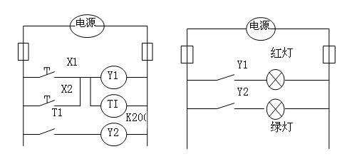 圖中X1、X2是兩個(gè)按鈕開關(guān),Y1、Y2是兩個(gè)繼電器,T1是時(shí)間繼電器。其工作是過程是:當(dāng)X1、X2任何一個(gè)按鈕按下,線圈Y1接通,Y1的常開觸點(diǎn)閉合,指示燈紅燈亮。此時(shí)時(shí)間繼電器T1同時(shí)接通并開始延時(shí),當(dāng)延時(shí)到2S后,線圈Y2接通,常開觸點(diǎn)閉合,綠燈亮。