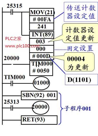(2) 當(dāng)00004輸入點(diǎn)接通250次時(shí)產(chǎn)生中斷,停止執(zhí)行主程序、并轉(zhuǎn)去執(zhí)行子程序001。