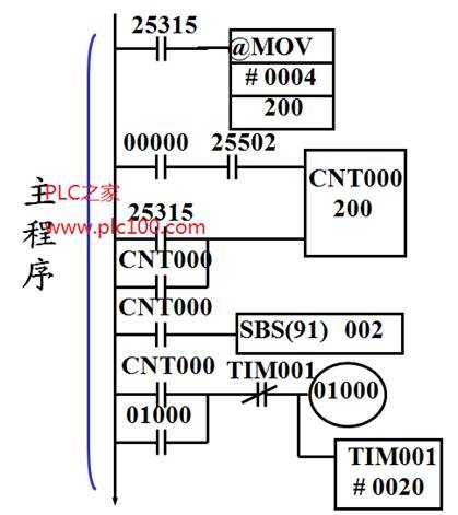 PLC上電,即將#0004傳送到通道200,復(fù)位CNT000。
