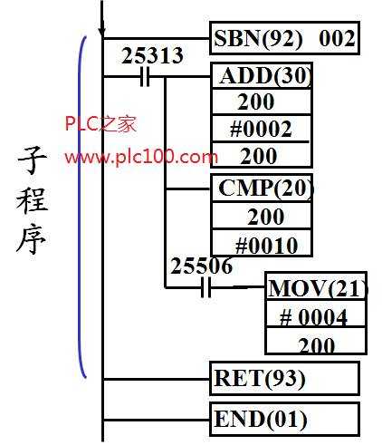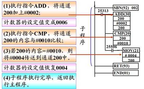 ②子程序執(zhí)行完畢,返回執(zhí)行主程序:將01000置為ON、并使TIM001開(kāi)始定時(shí)(2s)。
