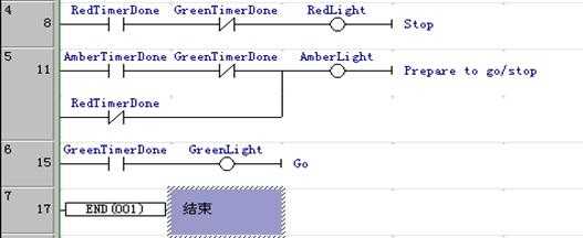 3)紅燈和黃燈計(jì)時(shí)器的右邊添加一個(gè)常閉接觸點(diǎn),把它分配給符號(hào) ‘GreenTimerDone’。 |